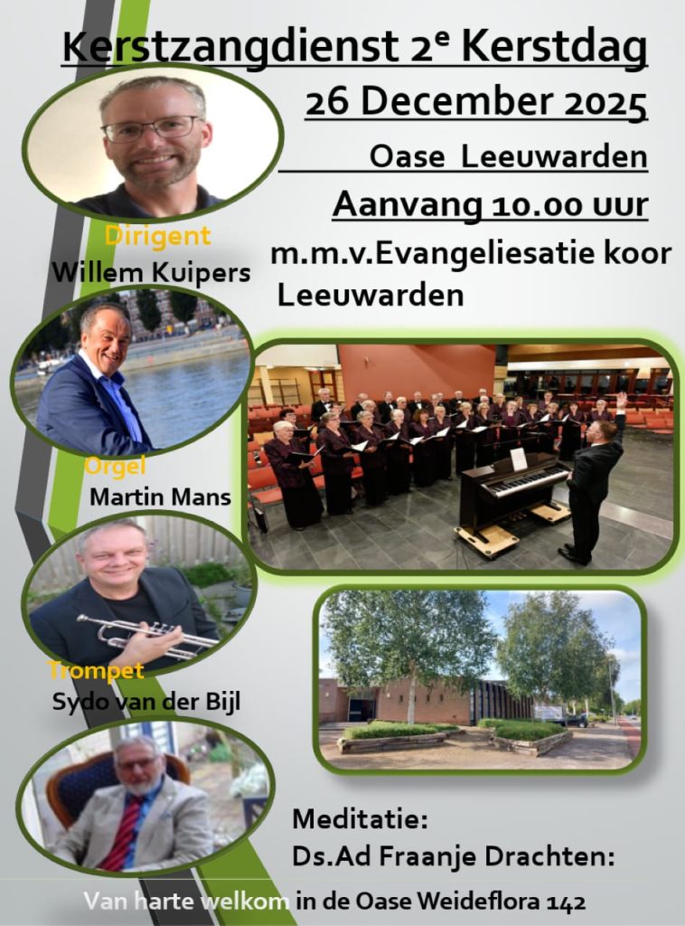 Op de Tweede Kerstdag is de inmiddels bekende zangdienst in de Oase. De dienst wordt georganiseerd door het Evangelisatiekoor. Zij zullen zingen o.l.v. hun dirigent Willem Kuipers. Het orgel wordt bespeeld door Martin Mans en de trompettist is Sydo van der Bijl. Voorganger is ds. A. Fraanje. De dienst begint om 10 uur.