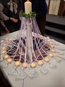 Op de gedachteniszondag werden alle namen opnieuw genoemd en de steentjes werden ineen cirkel gelegd zodat de steentjes verbonden waren met het licht (aangestoken met de Paaskaars). De familie kon daarna het kaarsje aansteken .